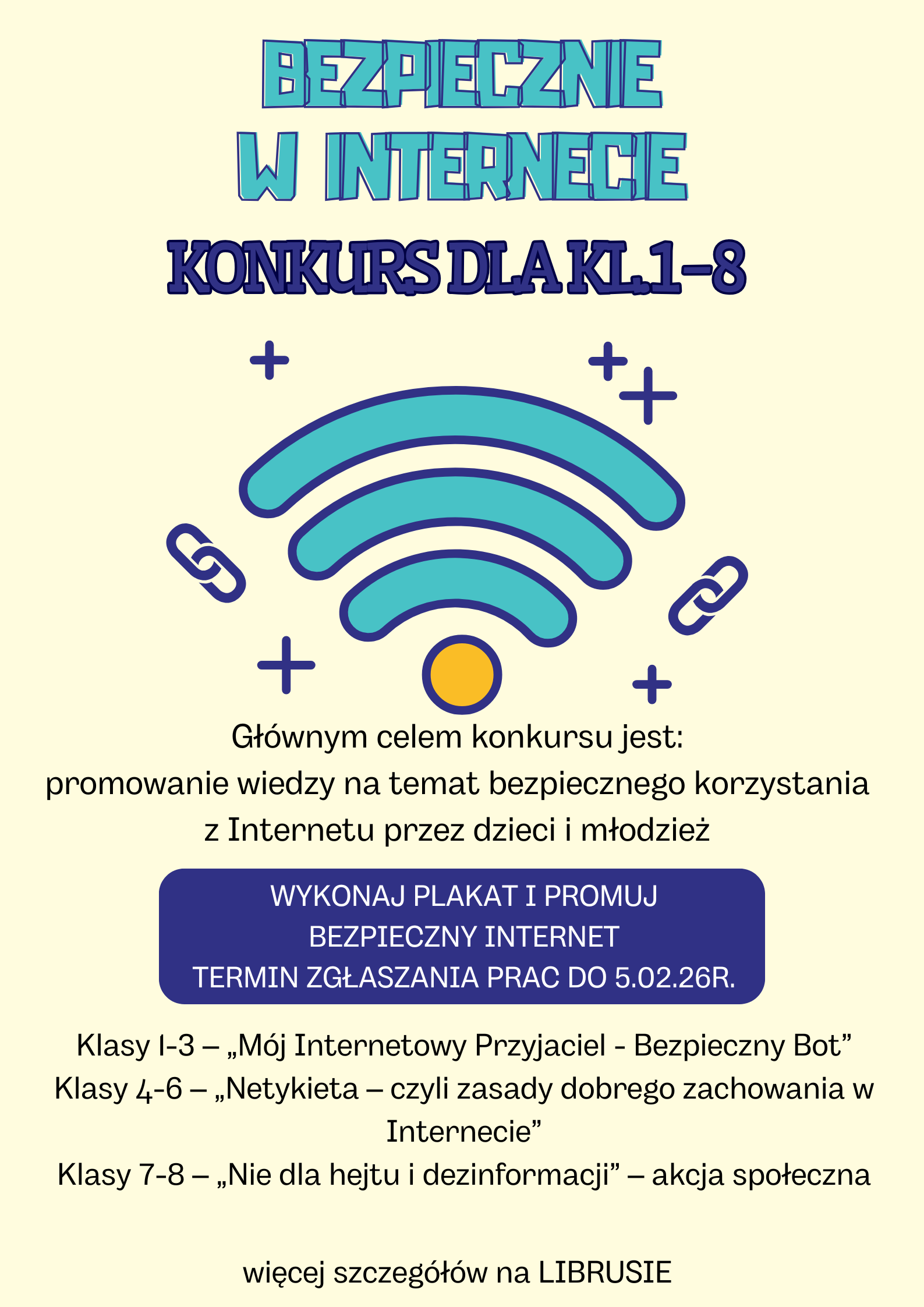 - podpisane plakaty można dostarczać do biblioteki i do gabinetu pedagogów (gabinet 005) do dnia 05.02.2026r.