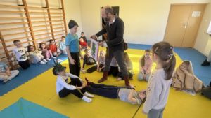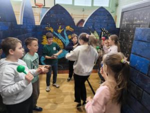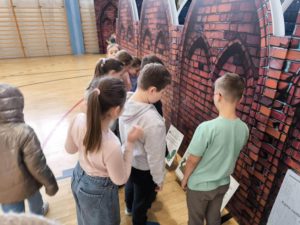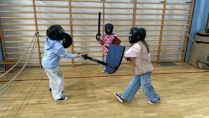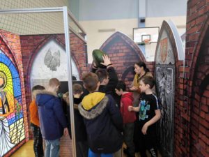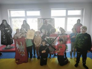 Natomiast sala gimnastyczna zamieniła się w obóz rycerski, gdzie trwały potyczki i treningi rycerskie na średniowiecznym torze przeszkód. Uczestnicy zajęć dyskutowali na temat walki o niezależność Księstwa Mazowieckiego, poznawali elementy uzbrojenia rycerskiego, mieli za zadanie stworzyć własny herb, a także najważniejsze – pokonać escape room pełen groźnych smoków i dotrzeć do tajemniczej krypty.