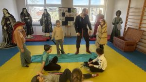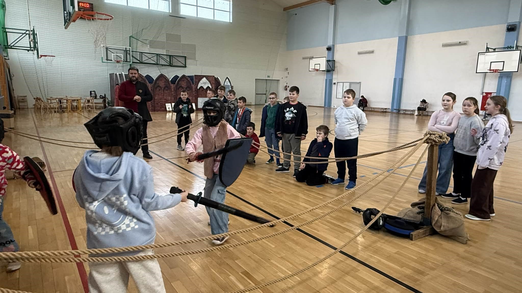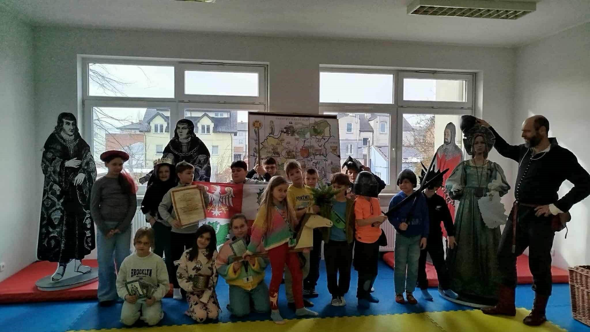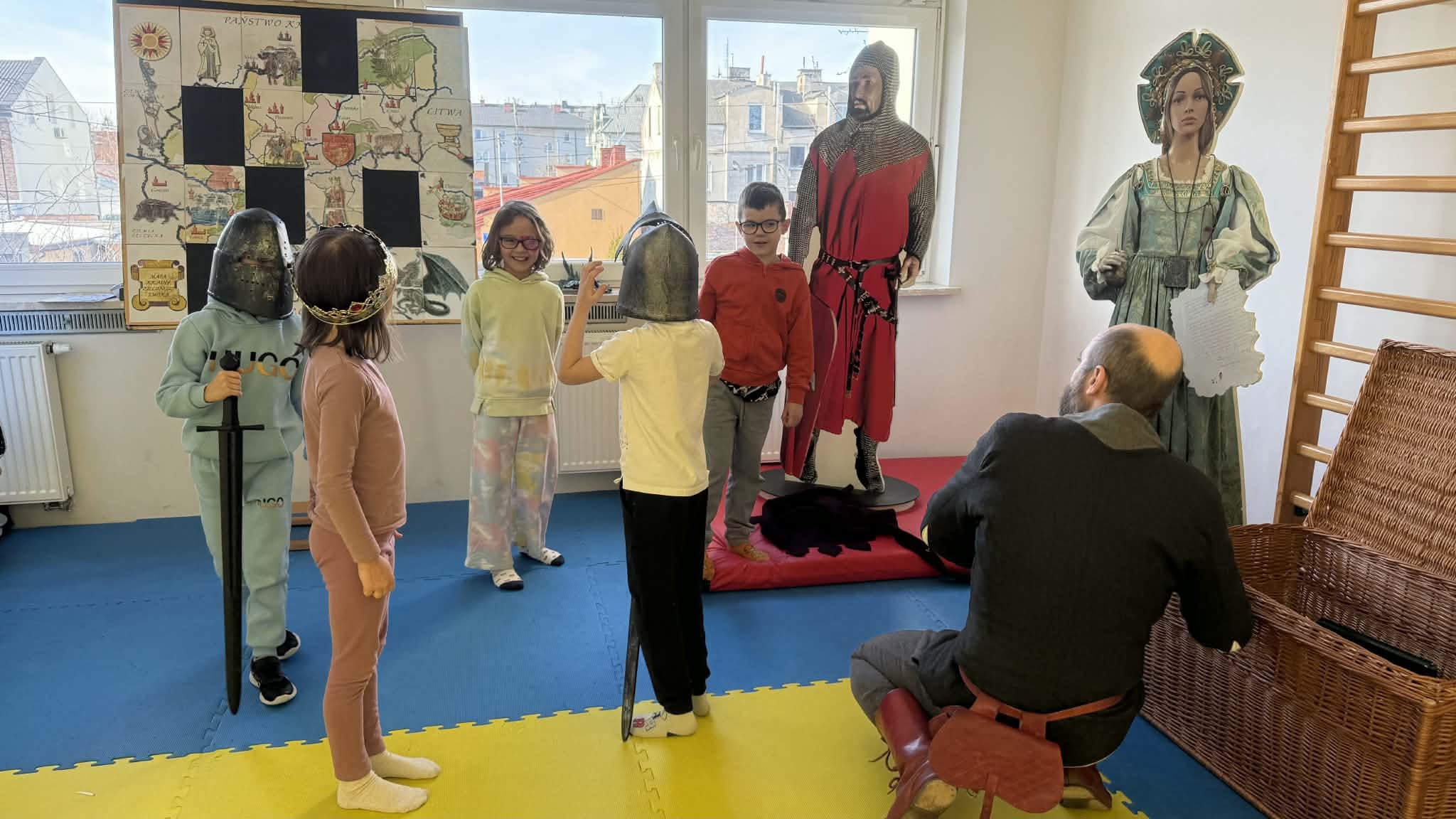 Natomiast sala gimnastyczna zamieniła się w obóz rycerski, gdzie trwały potyczki i treningi rycerskie na średniowiecznym torze przeszkód. Uczestnicy zajęć dyskutowali na temat walki o niezależność Księstwa Mazowieckiego, poznawali elementy uzbrojenia rycerskiego, mieli za zadanie stworzyć własny herb, a także najważniejsze – pokonać escape room pełen groźnych smoków i dotrzeć do tajemniczej krypty.