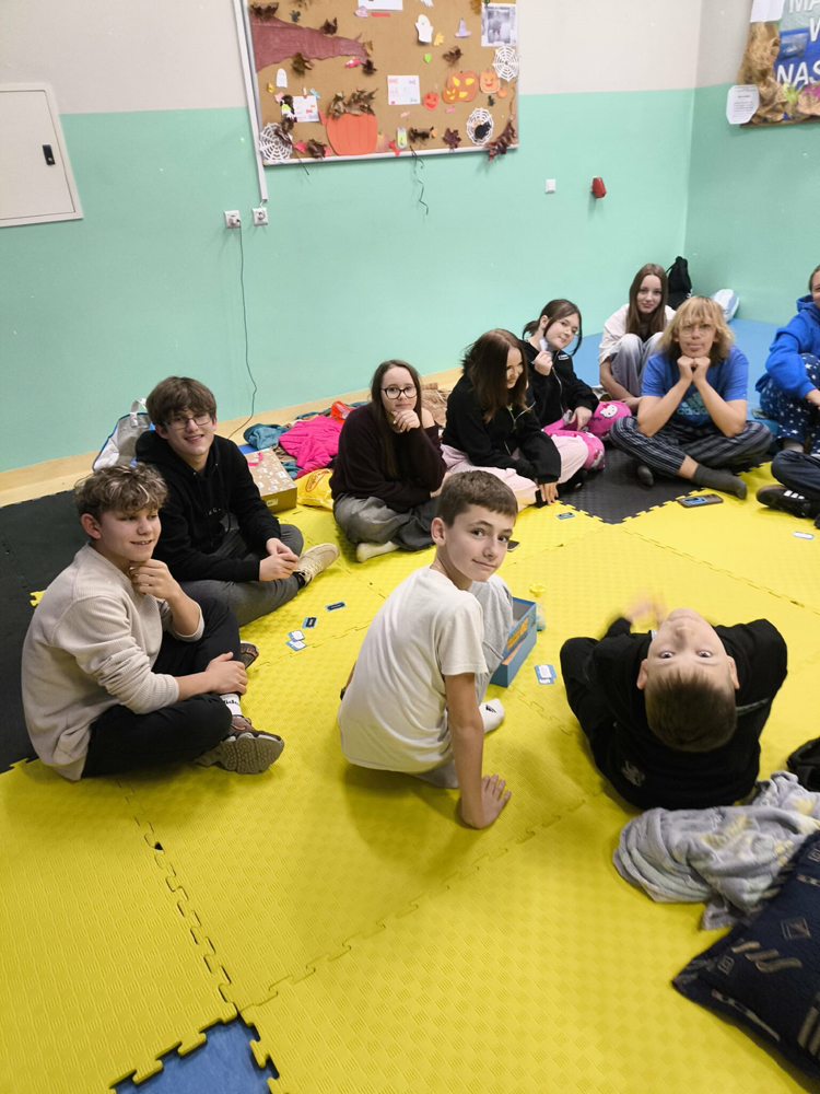 W nocy z 21 na 22 listopada 2025 r. w naszej szkole zrobiło się naprawdę wesoło — uczniowie klasy 7i mieli swoją niezapomnianą nocowankę! Było pełno śmiechu, zabawy i wspólnego spędzania czasu. Uczniowie zajadali się pysznymi goframi, słynnymi skrzydełkami „Maksia” i całą górą przekąsek, a między jednym kęsem a drugim trwały gry, tańce i rozmowy do późnej nocy.
